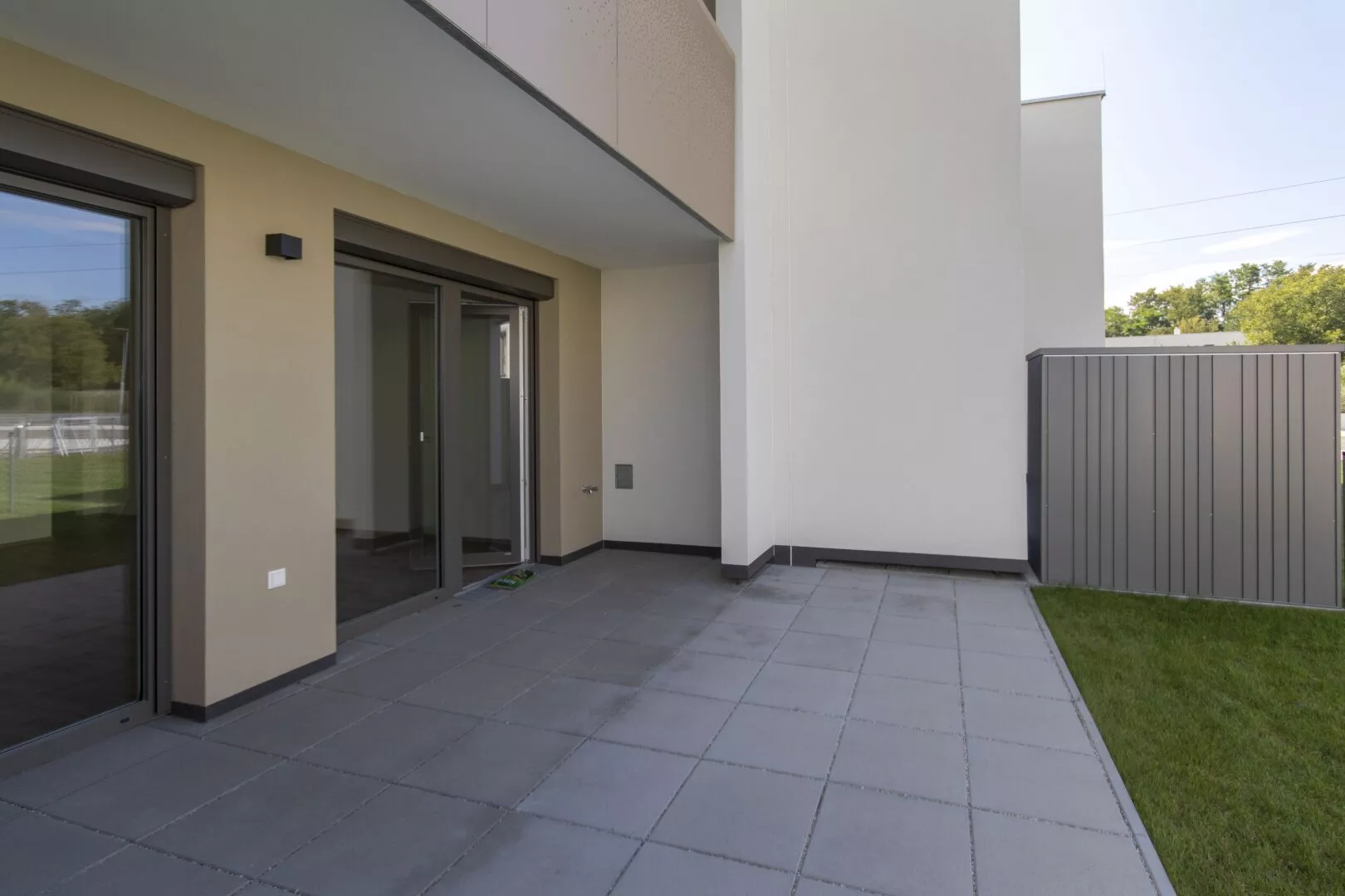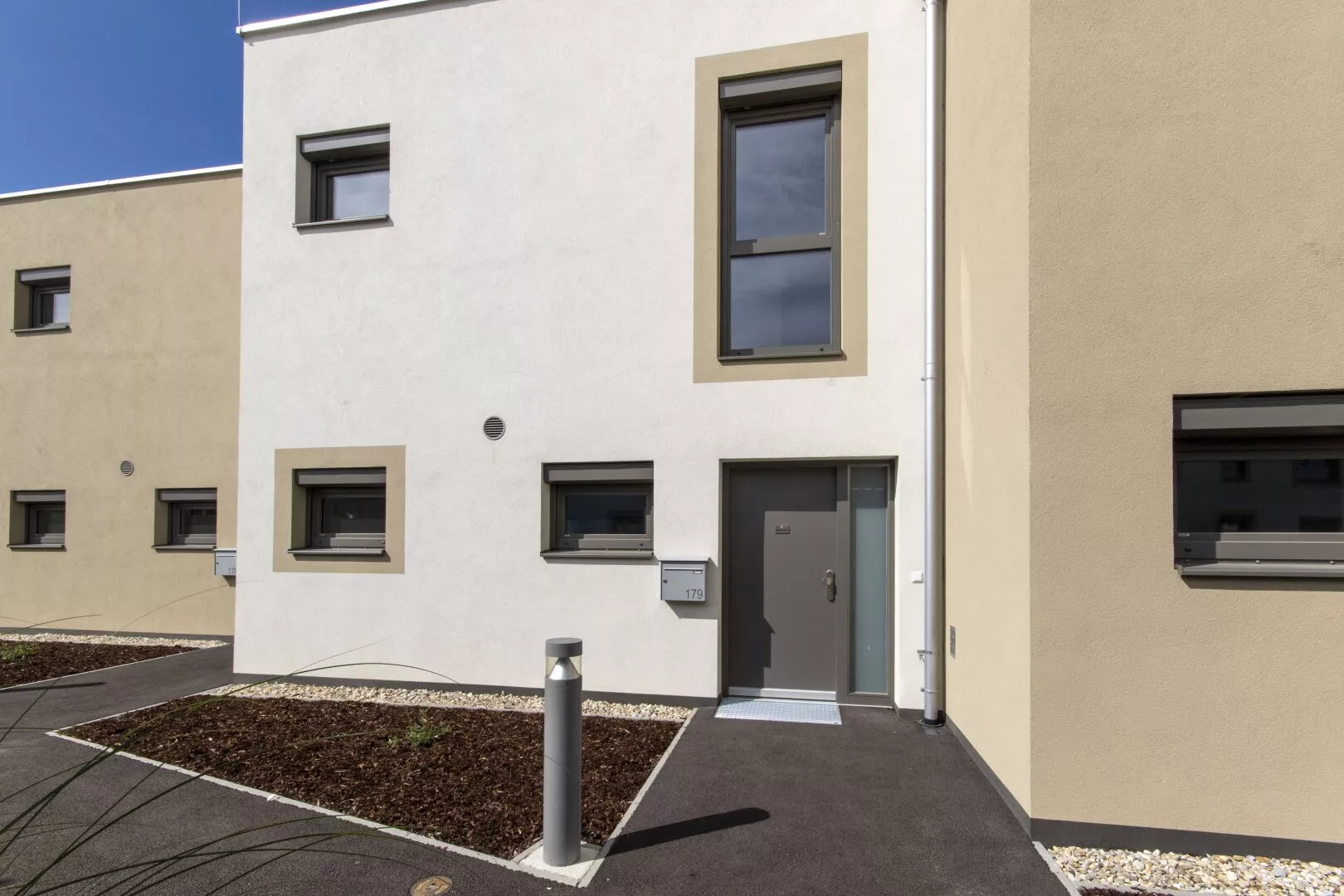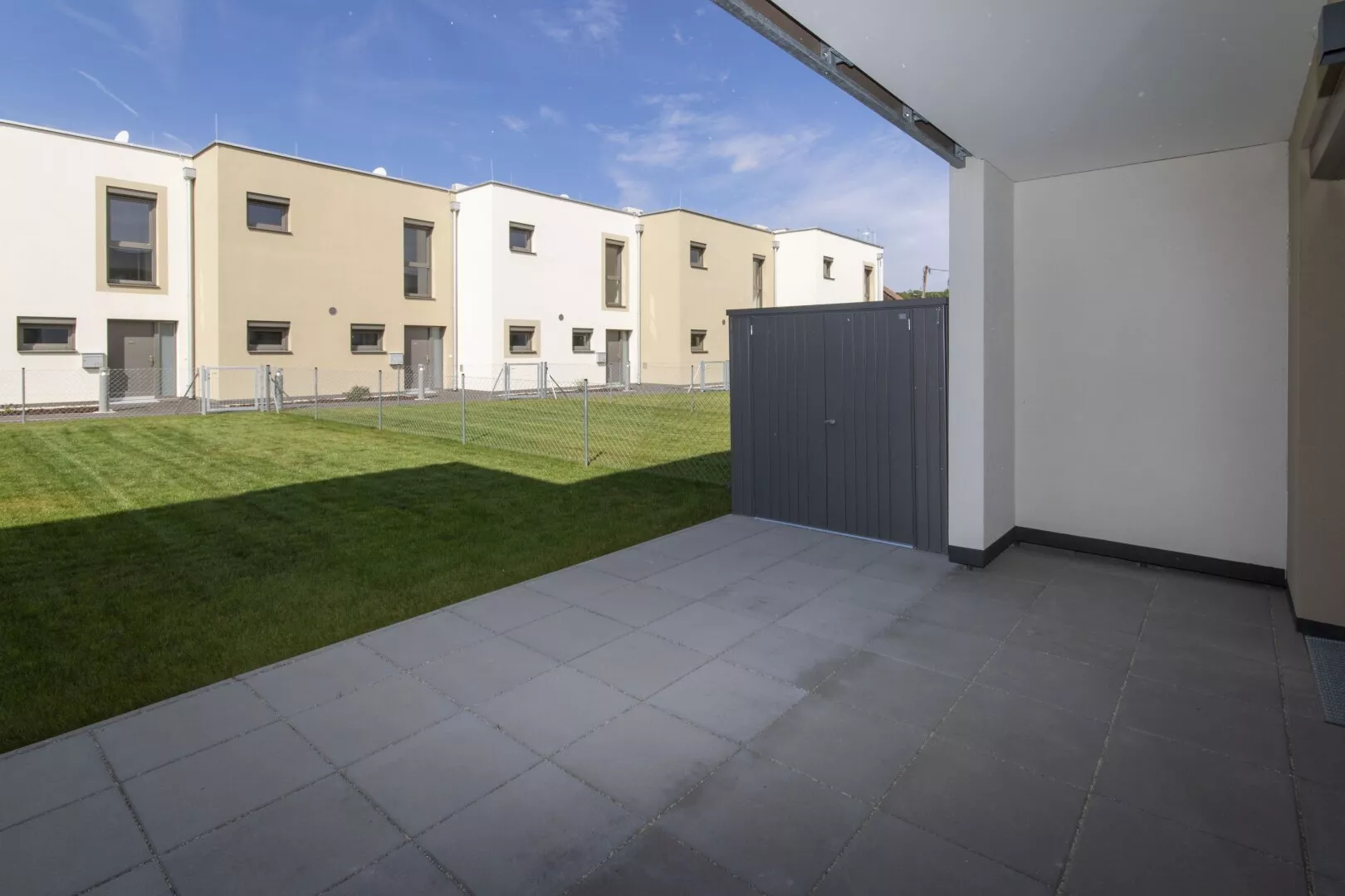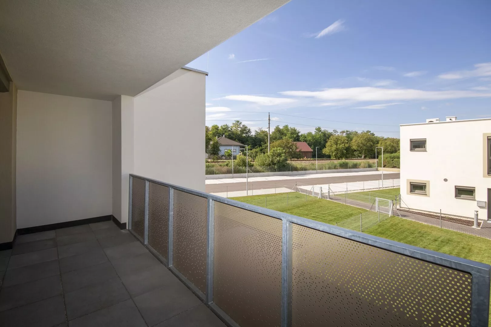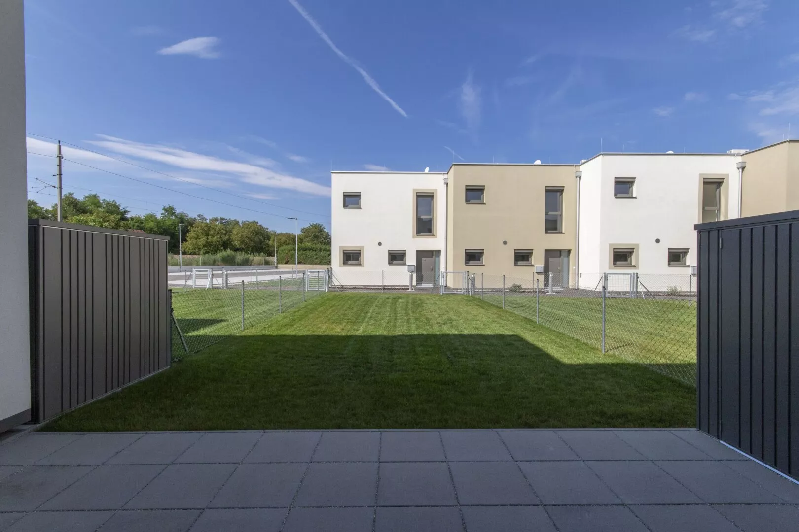 Fliesen, Laminat, Fußbodenheizung, Wohnküche / offene Küche, Westbalkon / -terrasse, Bad mit Fenster, Badewanne, Parkplatz, Luftwärmepumpe, Abstellraum, Rollladen, Flachdach, Massiv, Schlüsselfertig mit Bodenplatte, Kinderspielplatz, Kunststofffenster, kontrollierte Wohnraumlüftung, Grünblick, Photovoltaik Anlage