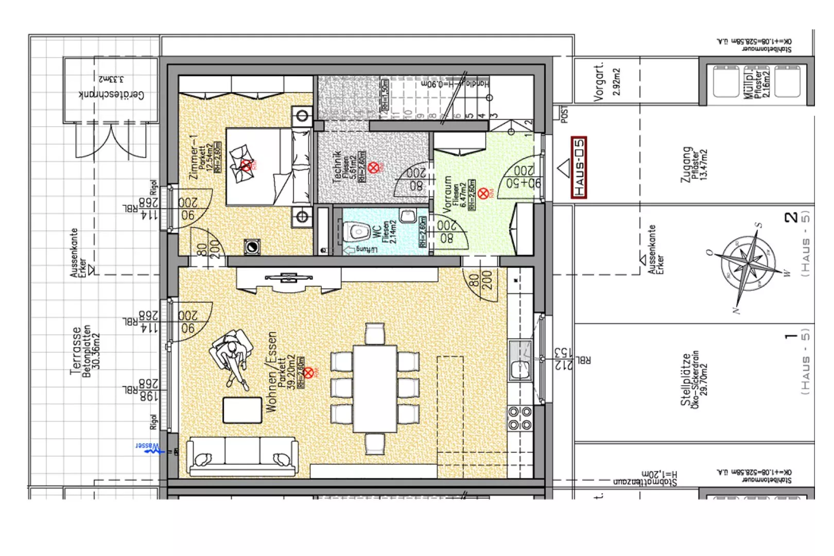 Fliesen, Parkett, Fußbodenheizung, Wohnküche / offene Küche, Ostbalkon / -terrasse, Westbalkon / -terrasse, Bad mit Fenster, Badewanne, Parkplatz, Luftwärmepumpe, Abstellraum, Getrennte Toiletten, Rollladen, Flachdach, Massiv, Schlüsselfertig mit Bodenplatte, Doppel- / Mehrfachverglasung, Kunststofffenster, Photovoltaik Anlage