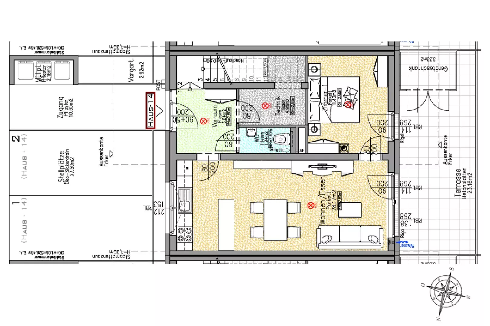 Fliesen, Parkett, Fußbodenheizung, Wohnküche / offene Küche, Ostbalkon / -terrasse, Westbalkon / -terrasse, Bad mit Fenster, Dusche, Parkplatz, Luftwärmepumpe, Abstellraum, Getrennte Toiletten, Rollladen, Flachdach, Massiv, Schlüsselfertig mit Bodenplatte, Doppel- / Mehrfachverglasung, Kunststofffenster, Photovoltaik Anlage