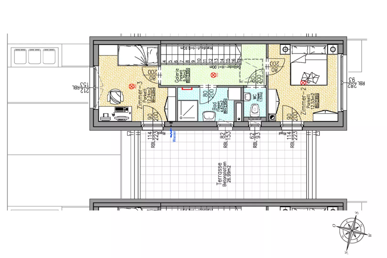 Man betritt das ost-westseitig ausgerichtete Reihenhaus im Erdgeschoss über einen zentral positionierten Vorraum, von dem man in die einladende Wohnküche und weiter in ein Zimmer mit Ausgang auf die Terrasse mit angrenzenden Garten gelangt. Ebenfalls wird vom Vorraum ein WC, der Technikraum und der Aufgang ins Obergeschoß erschlossen. Über die einläufige Stiege erreicht man das Obergeschoss, wo ebenfalls von einer zentralen Galerie zwei weitere Zimmer, ein Tageslicht-Bad mit Dusche und ein getrennt begehbares WC mit Fenster erreicht werden. Die großzügige Dachterrasse ist von beiden Zimmern im Obergeschoß aus begehbar.