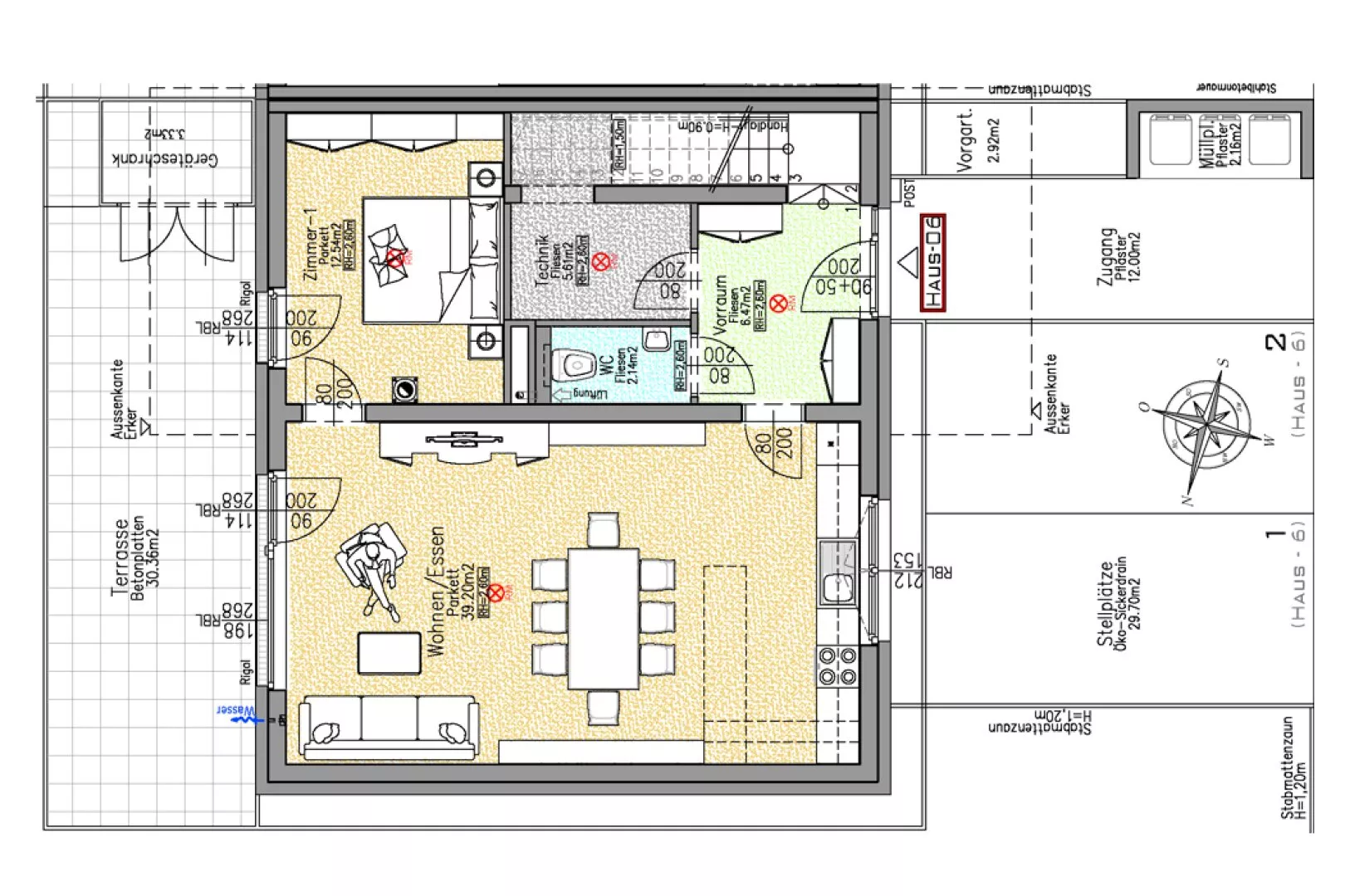 Fliesen, Parkett, Fußbodenheizung, Wohnküche / offene Küche, Ostbalkon / -terrasse, Westbalkon / -terrasse, Bad mit Fenster, Badewanne, Parkplatz, Luftwärmepumpe, Abstellraum, Getrennte Toiletten, Rollladen, Flachdach, Massiv, Schlüsselfertig mit Bodenplatte, Doppel- / Mehrfachverglasung, Kunststofffenster, Photovoltaik Anlage
