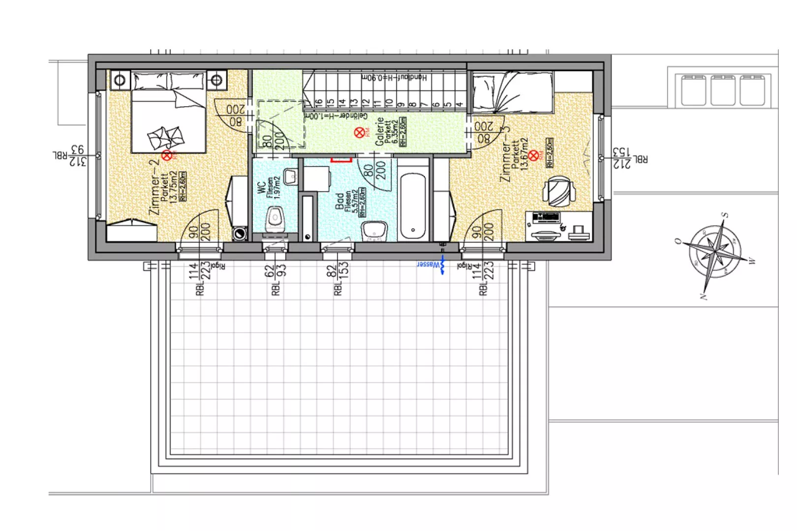 Man betritt das ost-westseitig ausgerichtete Reihenhaus im Erdgeschoss über einen zentral positionierten Vorraum, von dem man in die einladende Wohnküche und weiter in ein Zimmer mit Ausgang auf die Terrasse mit angrenzenden Garten gelangt. Ebenfalls wird vom Vorraum ein WC, der Technikraum und der Aufgang ins Obergeschoß erschlossen. Über die einläufige Stiege erreicht man das Obergeschoss, wo ebenfalls von einer zentralen Galerie zwei weitere Zimmer, ein Tageslicht-Bad mit Badewanne und ein getrennt begehbares WC mit Fenster erreicht werden. Die großzügige Dachterrasse ist von beiden Zimmern im Obergeschoß aus begehbar.