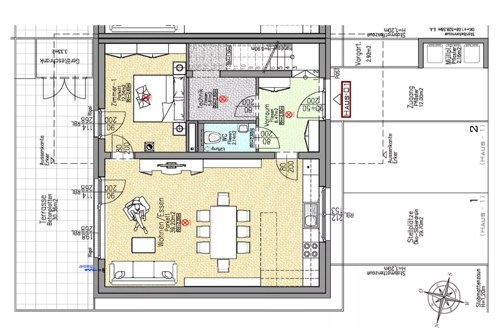 Zu jedem Reihenhaus gehören ein Geräteschrank auf der Terrasse im Erdgeschoss sowie zwei Autoabstellplätze im Freien und ein kleiner Müllplatz direkt vor dem Haus.
