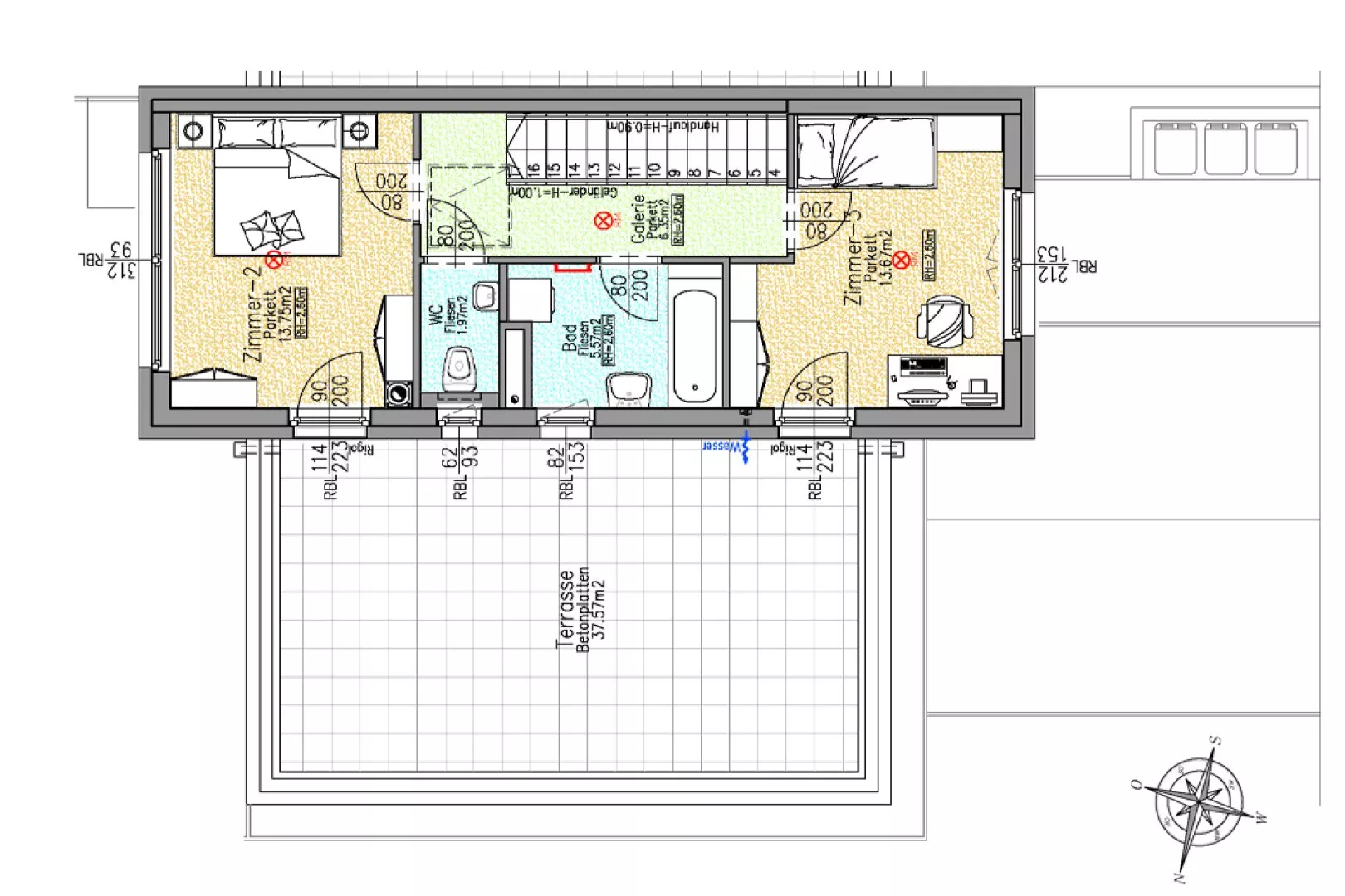 Man betritt das ost-westseitig ausgerichtete Reihenhaus im Erdgeschoss über einen zentral positionierten Vorraum, von dem man in die einladende Wohnküche und weiter in ein Zimmer mit Ausgang auf die Terrasse mit angrenzenden Garten gelangt. Ebenfalls wird vom Vorraum ein WC, der Technikraum und der Aufgang ins Obergeschoß erschlossen. Über die einläufige Stiege erreicht man das Obergeschoss, wo ebenfalls von einer zentralen Galerie zwei weitere Zimmer, ein Tageslicht-Bad mit Badewanne und ein getrennt begehbares WC mit Fenster erreicht werden. Die großzügige Dachterrasse ist von beiden Zimmern im Obergeschoß aus begehbar.