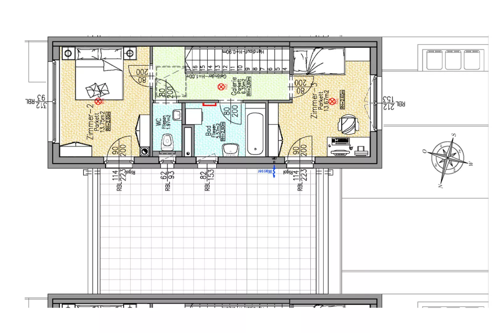 Man betritt das ost-westseitig ausgerichtete Reihenhaus im Erdgeschoss über einen zentral positionierten Vorraum, von dem man in die einladende Wohnküche und weiter in ein Zimmer mit Ausgang auf die Terrasse mit angrenzenden Garten gelangt. Ebenfalls wird vom Vorraum ein WC, der Technikraum und der Aufgang ins Obergeschoß erschlossen. Über die einläufige Stiege erreicht man das Obergeschoss, wo ebenfalls von einer zentralen Galerie zwei weitere Zimmer, ein Tageslicht-Bad mit Badewanne und ein getrennt begehbares WC mit Fenster erreicht werden. Die großzügige Dachterrasse ist von beiden Zimmern im Obergeschoß aus begehbar.
