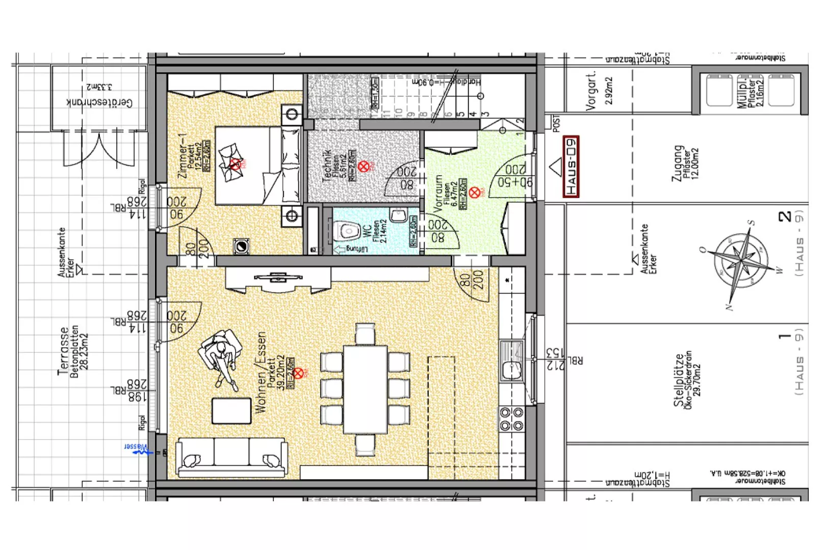 Fliesen, Parkett, Fußbodenheizung, Wohnküche / offene Küche, Ostbalkon / -terrasse, Westbalkon / -terrasse, Bad mit Fenster, Badewanne, Parkplatz, Luftwärmepumpe, Abstellraum, Getrennte Toiletten, Rollladen, Flachdach, Massiv, Schlüsselfertig mit Bodenplatte, Doppel- / Mehrfachverglasung, Kunststofffenster, Photovoltaik Anlage