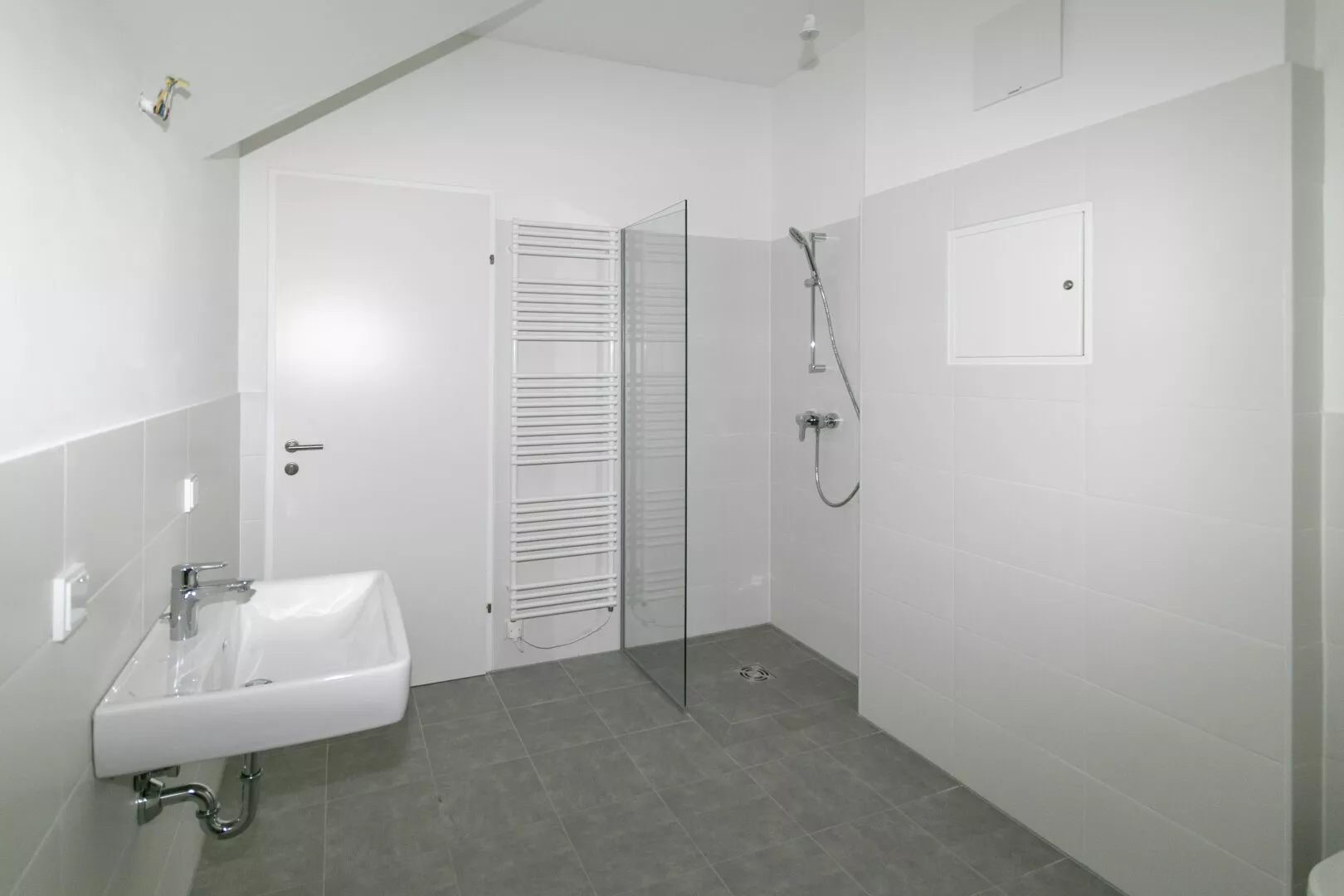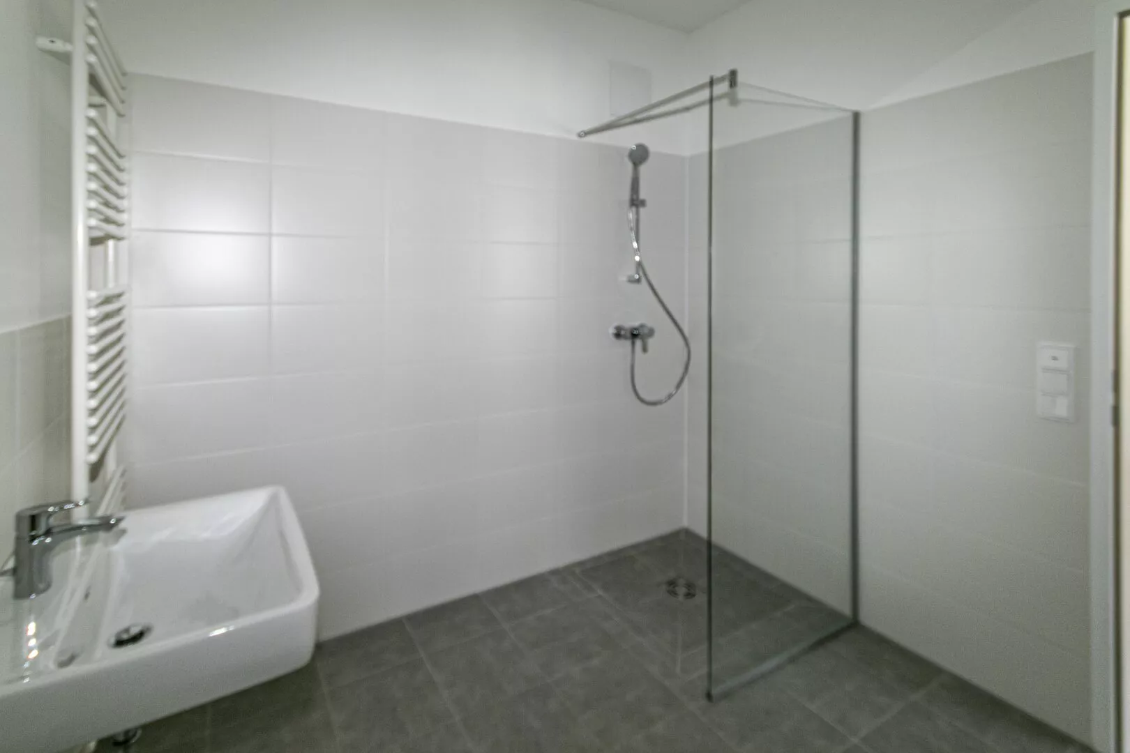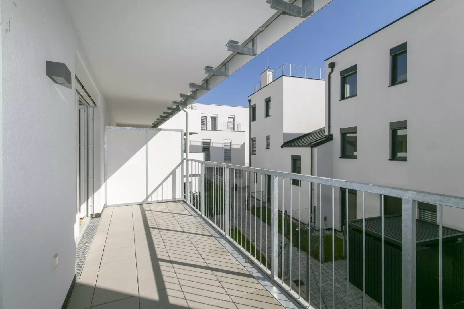 Über eine einläufige Stiege erreicht man das 1. Obergeschoß. Dort öffnet sich eine großzügige Wohnküche mit großen ostseitigen Balkon, eine Garderobe, Schlafzimmer mit zugehörigen Bad mit Dusche, sowie ein getrenntes WC mit Handwaschbecken.