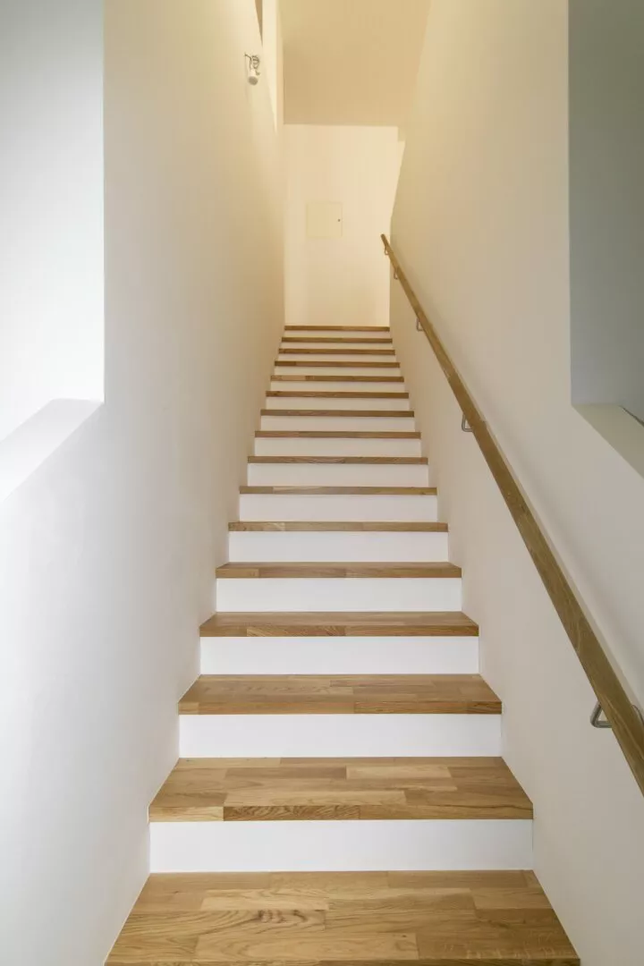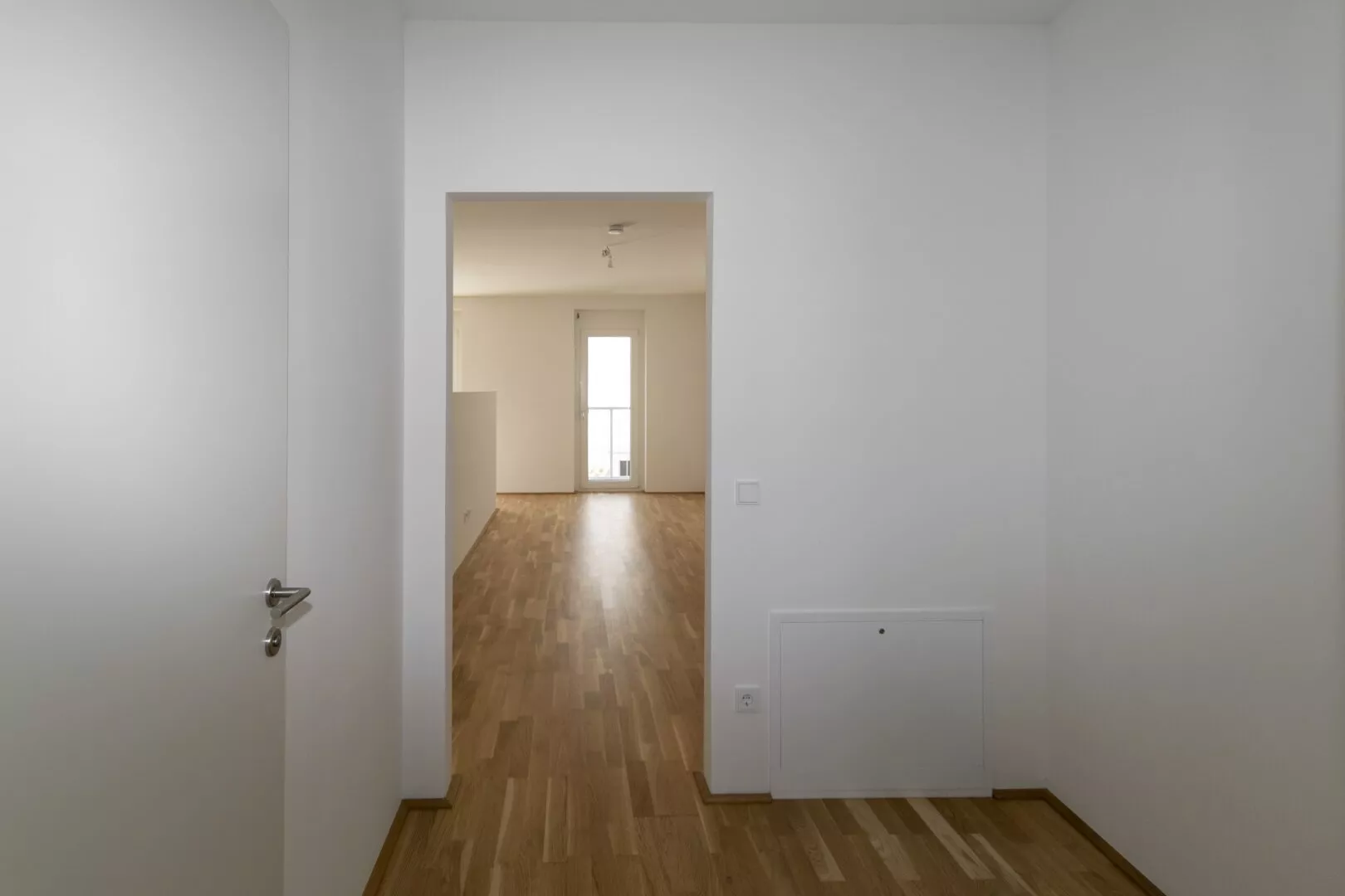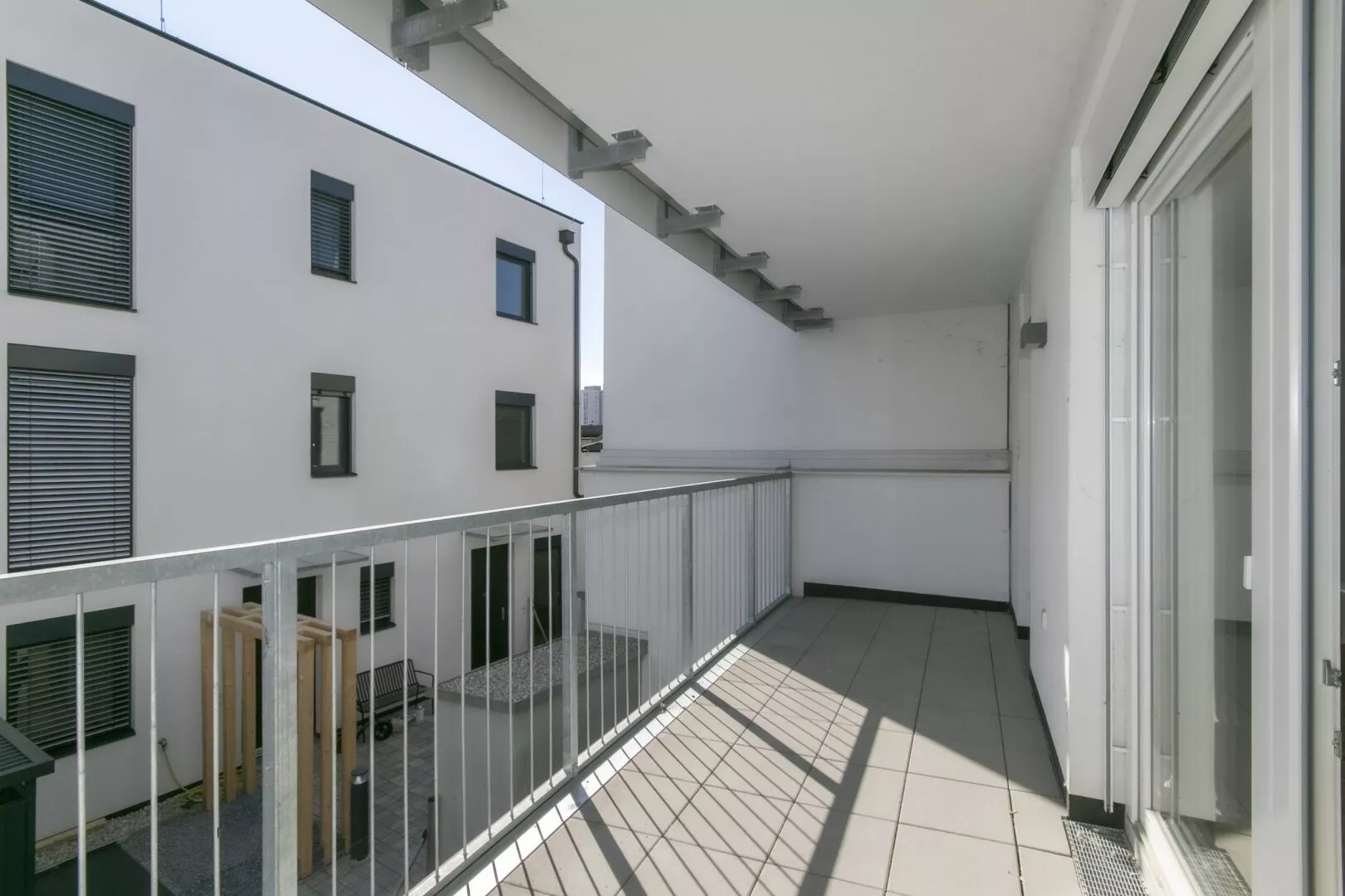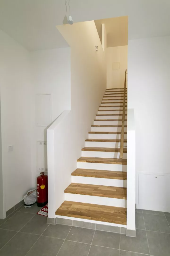 Über eine einläufige Stiege erreicht man das 1. Obergeschoß. Dort öffnet sich eine großzügige Wohnküche mit großen ostseitigen Balkon, eine Garderobe, Schlafzimmer mit zugehörigen Bad mit Dusche, sowie ein getrenntes WC mit Handwaschbecken.