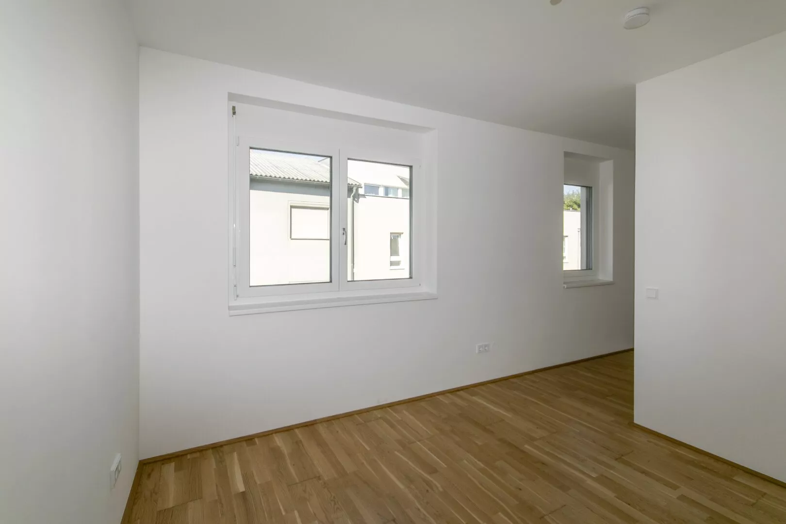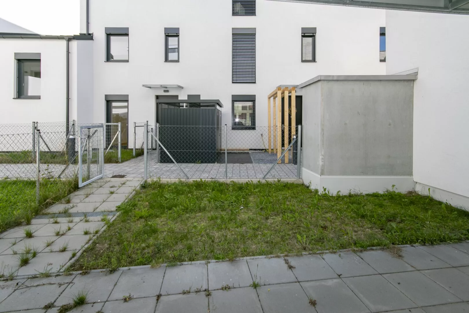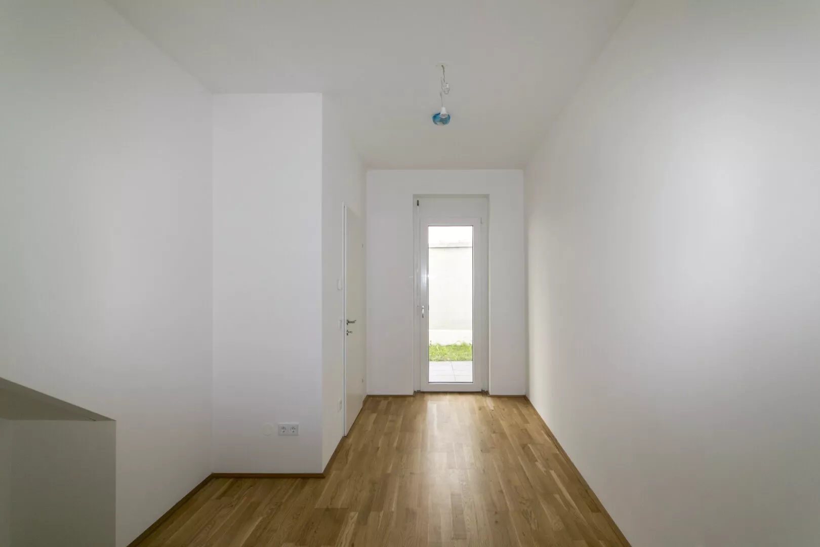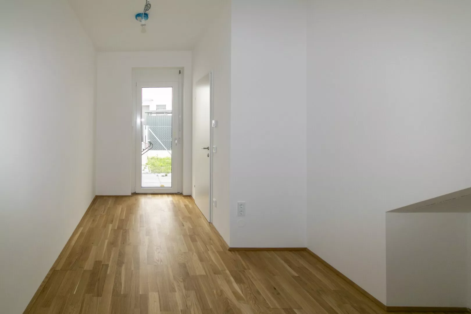 Man betritt die Wohnung über einen kleinen Vorgarten sowie einer großen Terrasse. Im Erdgeschoß befinden sich ein Vorraum, 2 Zimmer mit zugehörigen Schrankraum und ein Bad mit Dusche und WC, welches von beiden Zimmern begehbar ist.
