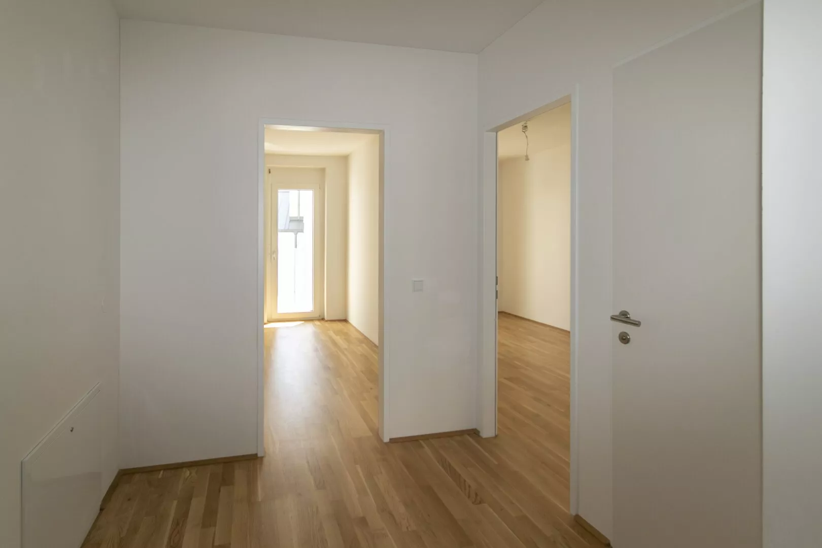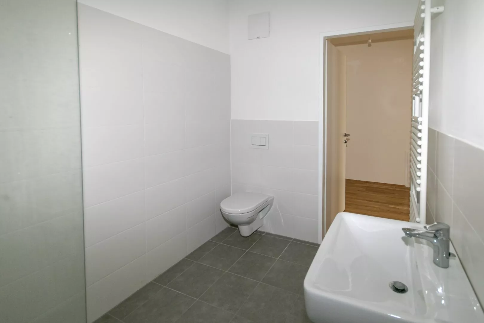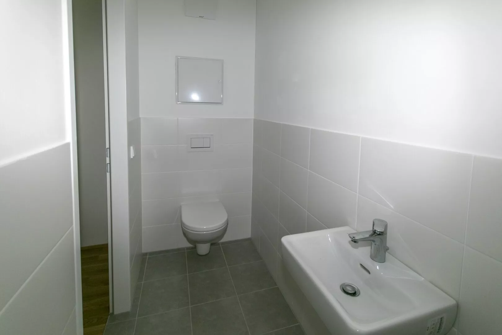 Man betritt die Wohnung über einen Vorgarten sowie über eine große Terrasse. Im Erdgeschoß befinden sich ein Vorraum, eine Garderobe mit anschließendem WC mit Handwaschbecken sowie die geräumige Wohnküche mit Ausgang auf die Terrasse und in den Garten.