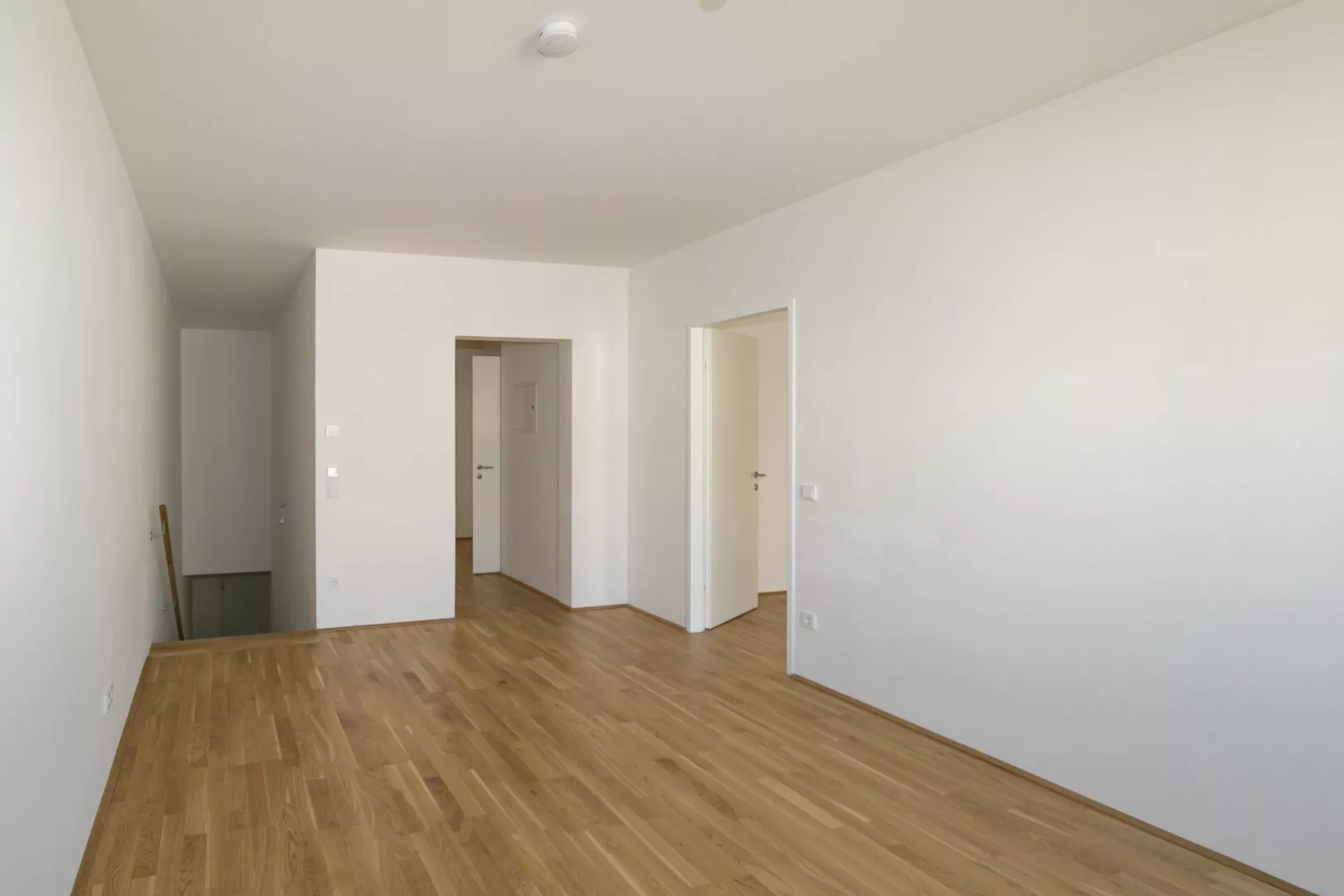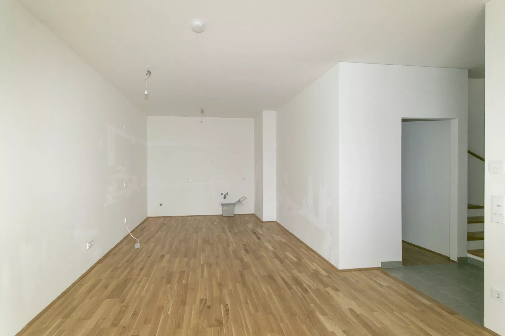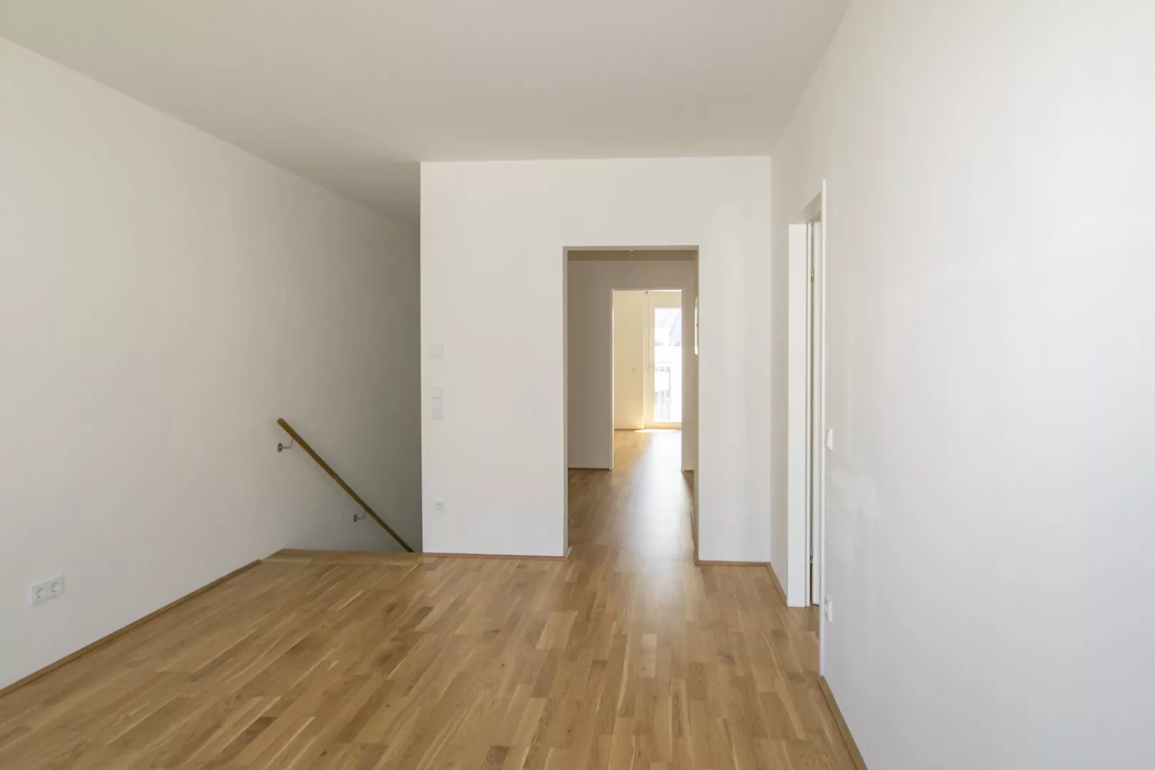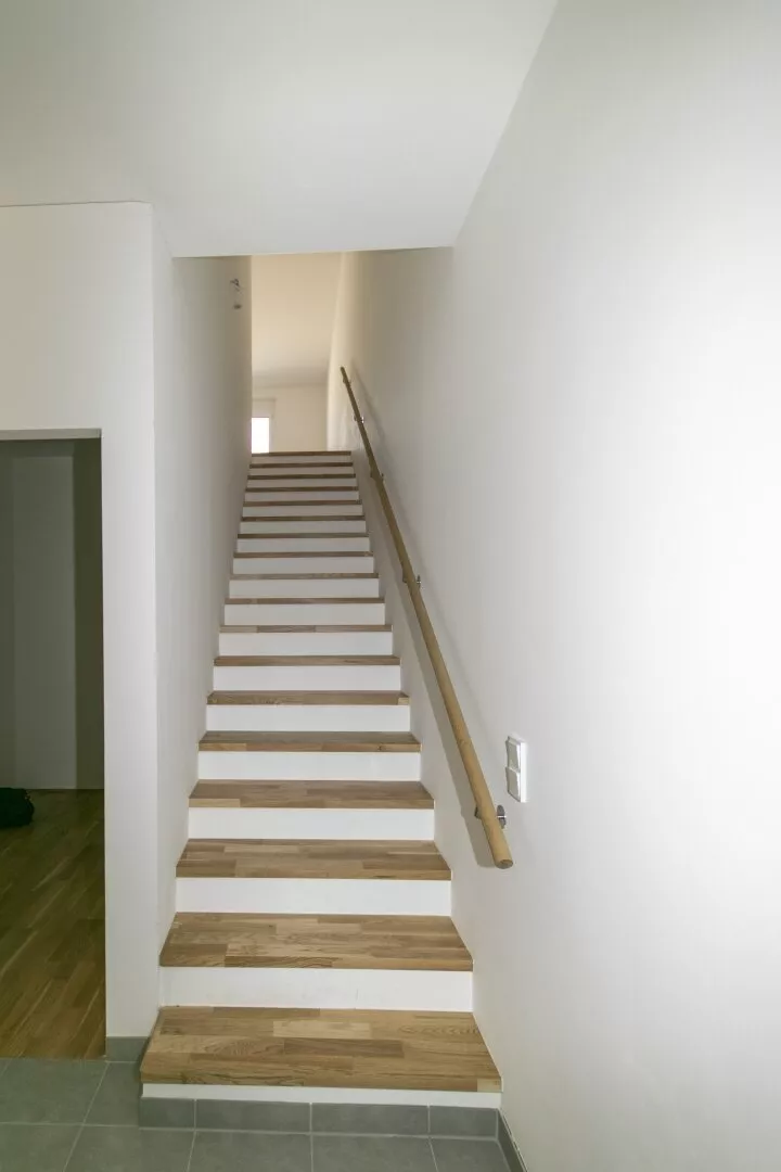 Über eine einläufige Stiege erreicht man das 1. Obergeschoß wo sich ein zweiter offener Wohnraum befindet. Es gibt 3 getrennt begehbare Zimmer, einen zentraler Schrankraum und ein Bad mit Dusche und WC. Zwei Zimmer haben einen direkten Zugang zum großzügige Balkon.