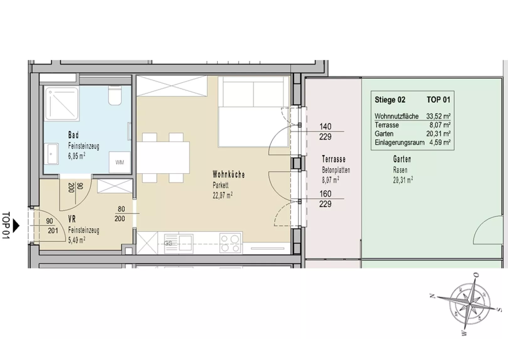 Zur Wohnung gehört ein Einlagerungsraum und ein Autoabstellplatz im Freien.