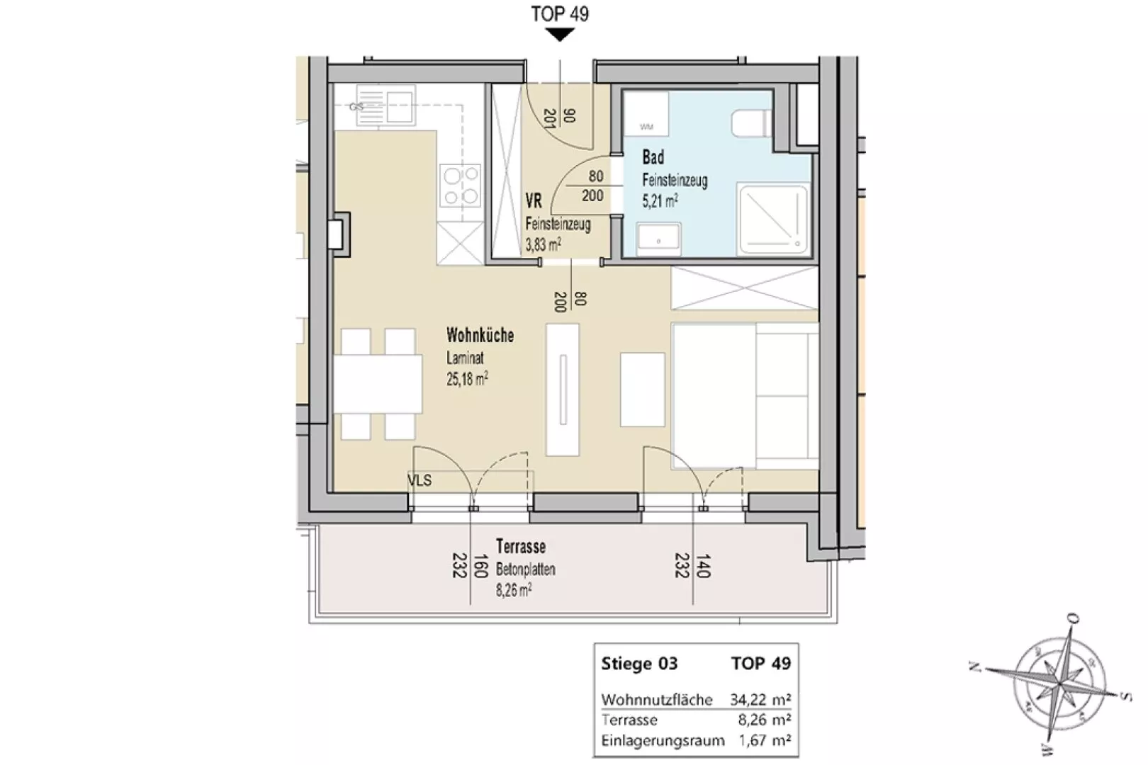 Zur Wohnung gehört ein Einlagerungsraum und ein Autoabstellplatz im Freien.