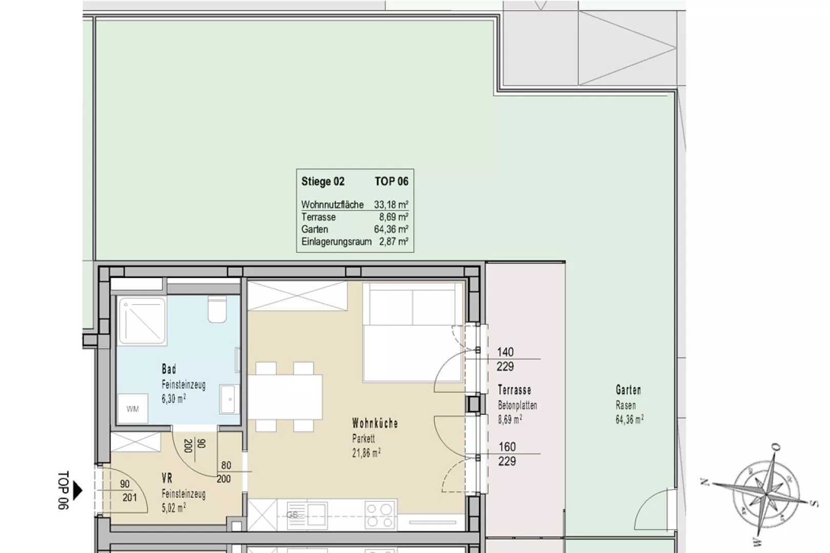 Zur Wohnung gehört ein Einlagerungsraum und ein Autoabstellplatz im Freien.