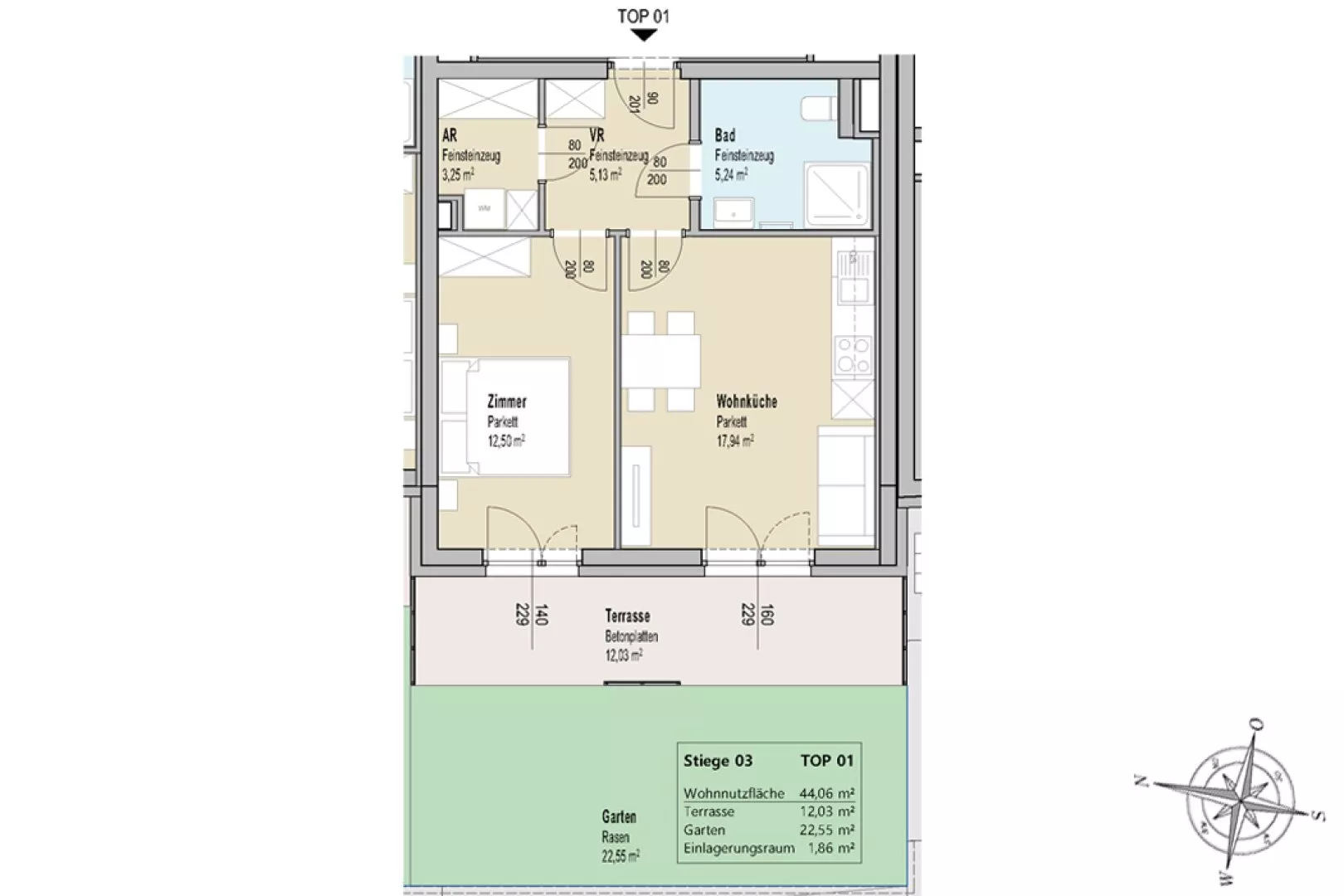 Zur Wohnung gehört ein Einlagerungsraum und ein Autoabstellplatz im Freien.
