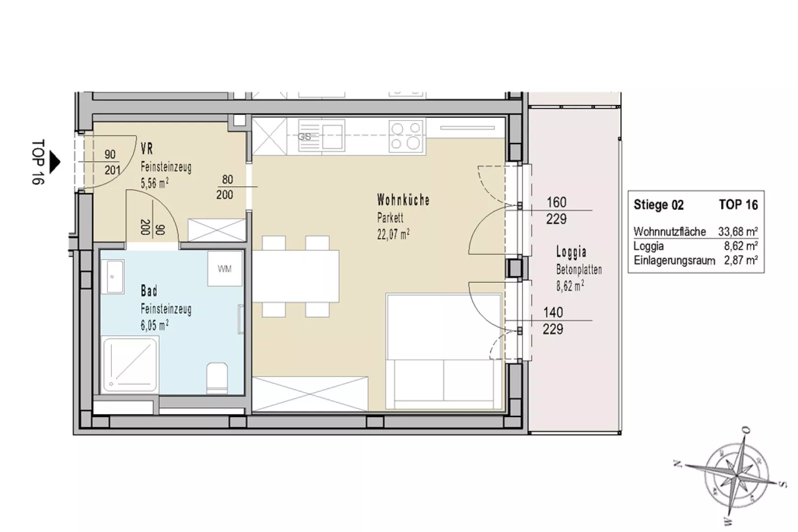 Zur Wohnung gehört ein Einlagerungsraum und ein Autoabstellplatz im Freien.