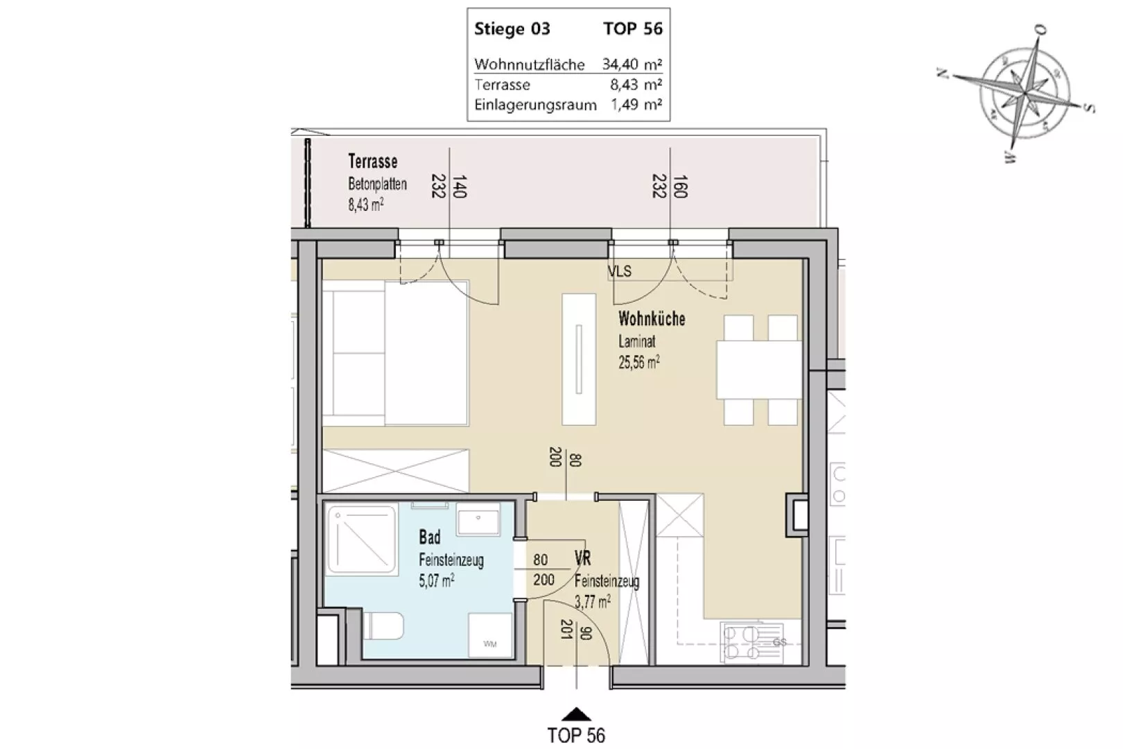 Zur Wohnung gehört ein Einlagerungsraum und ein Autoabstellplatz im Freien.