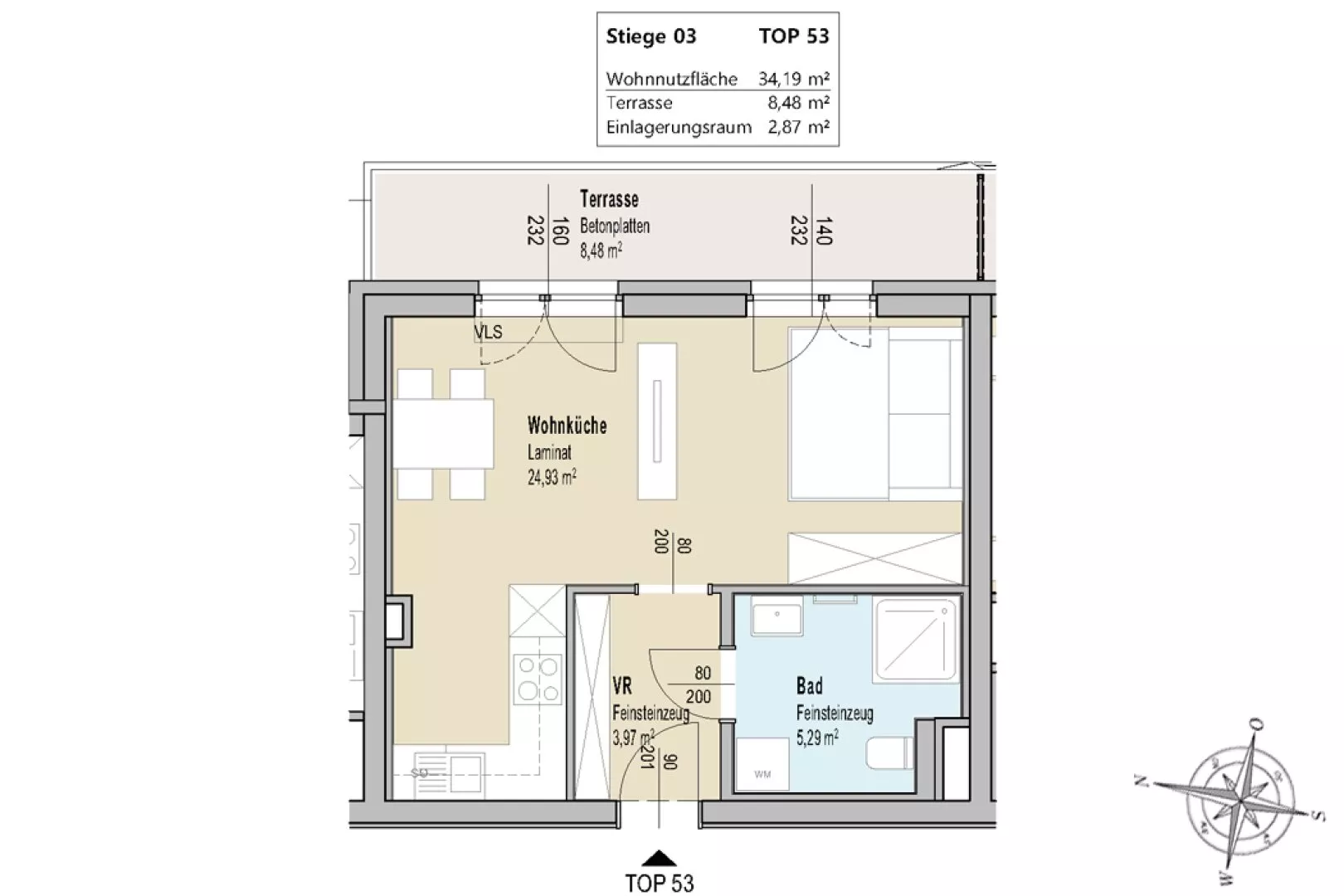 Zur Wohnung gehört ein Einlagerungsraum und ein Autoabstellplatz im Freien.