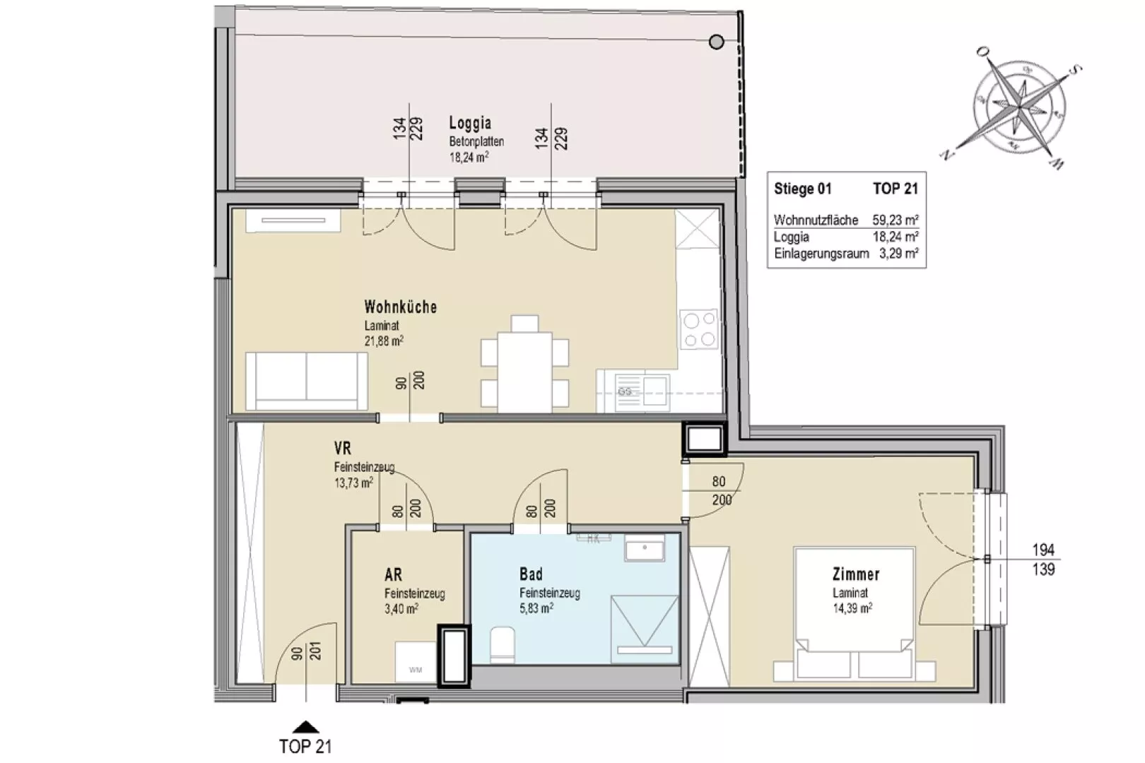 Zur Wohnung gehört ein Einlagerungsraum und ein Autoabstellplatz (€ 33,00/Monat) im Freien.