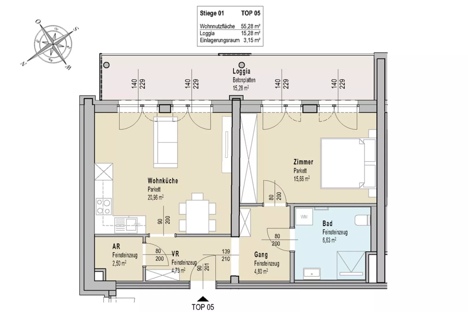Zur Wohnung gehört ein Einlagerungsraum und ein Autoabstellplatz (€ 33,00/Monat) im Freien.