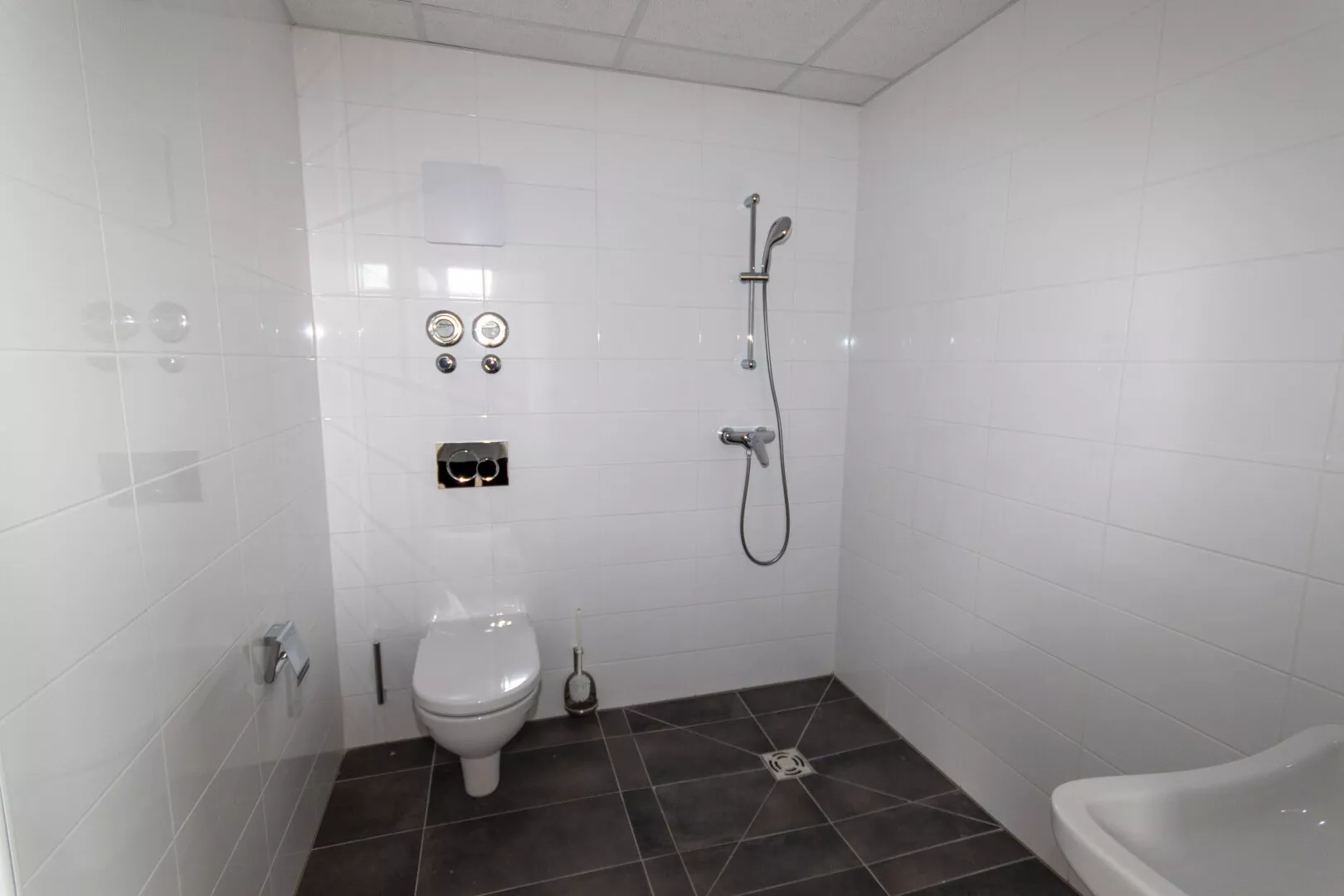 Geheizt wird im Winter mit Fernwärme und im Sommer sorgt die Deckenkühlung über Bauteilaktivierung sowie die 3-fach-isolierverglasten Fenster mit elektrischen Außenraffstore für ein angenehmes Raumklima. Das Bad ist behindertengerecht eingerichtet und verfügt über eine bodenebene Dusche.