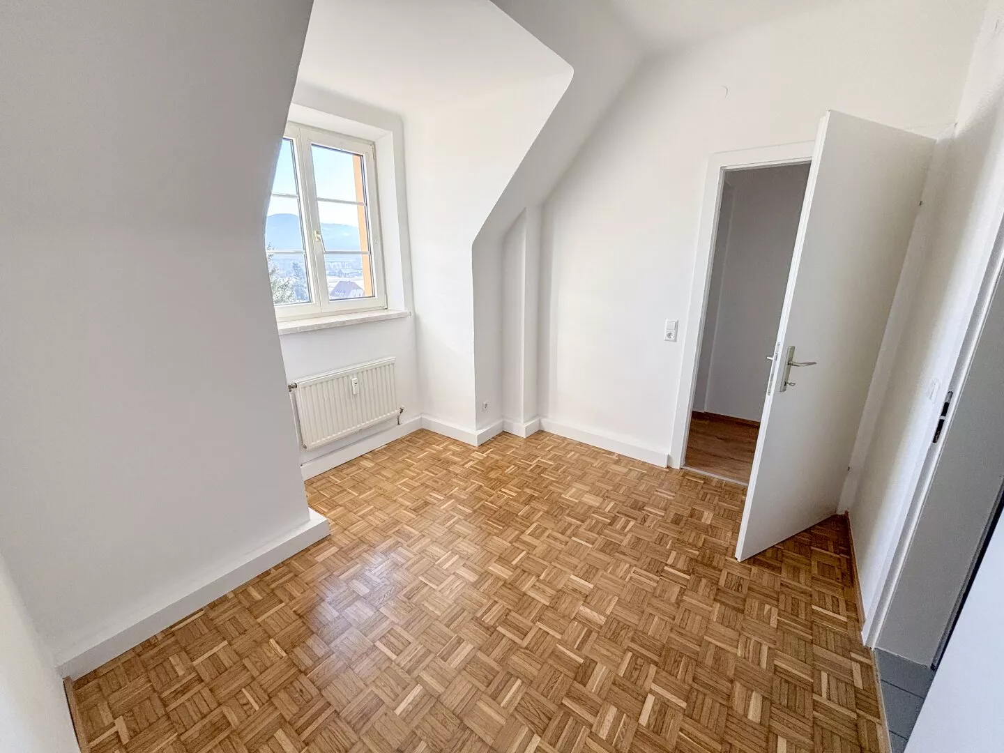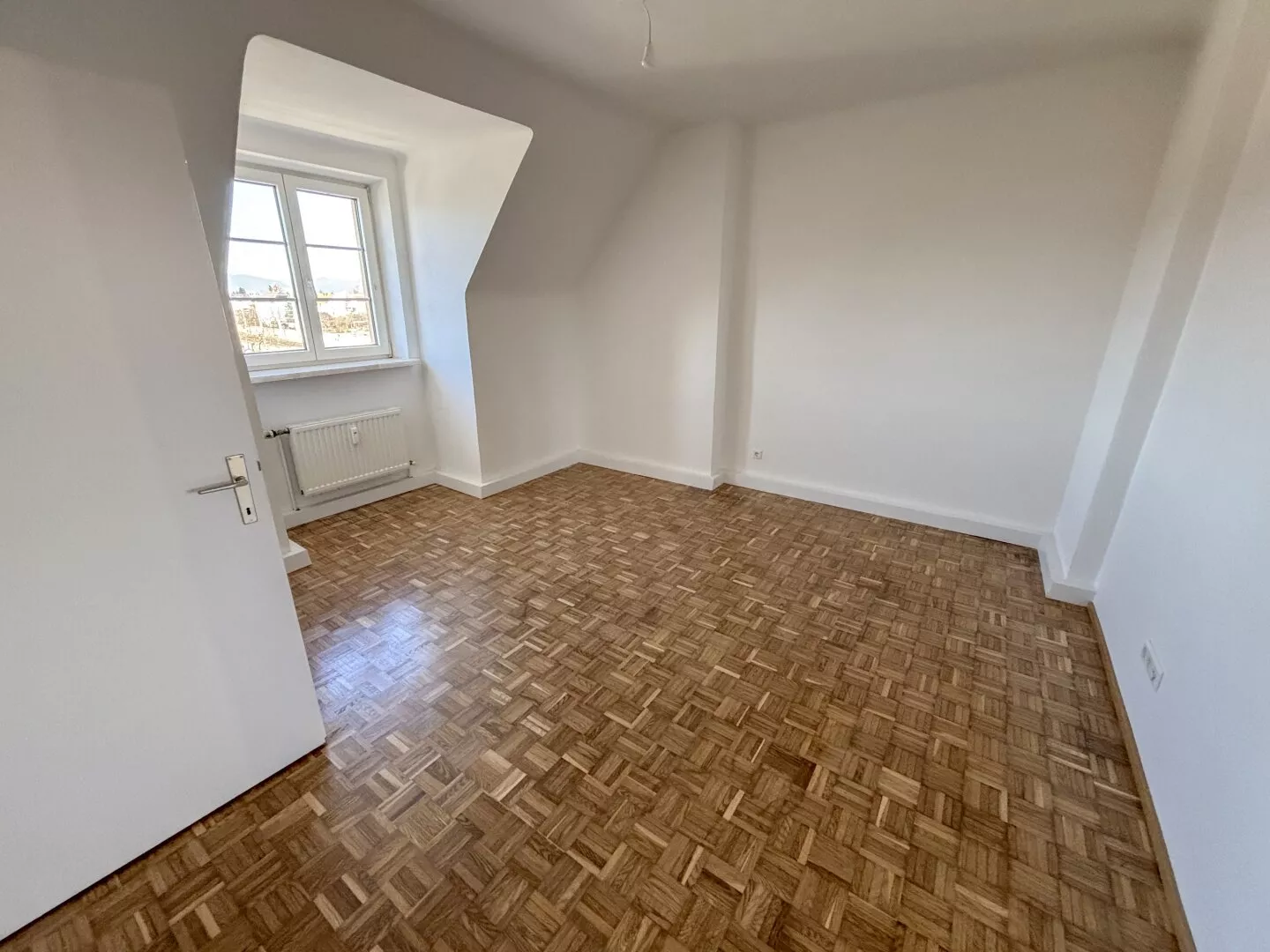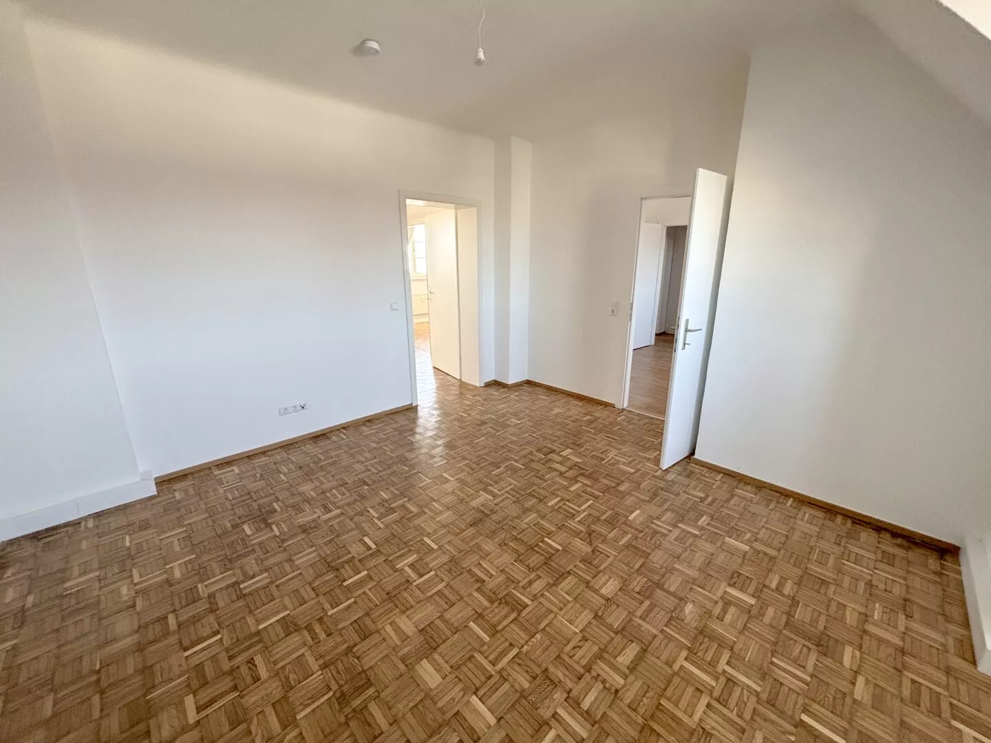 Die Dachgeschoßwohnung besteht aus einem Vorraum, einer Essküche, drei Zimmer, einem Bad mit Dusche und einem getrennten WC mit Fenster.