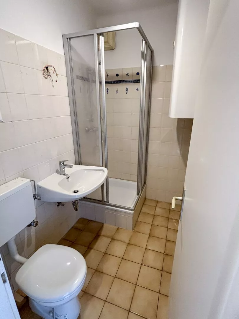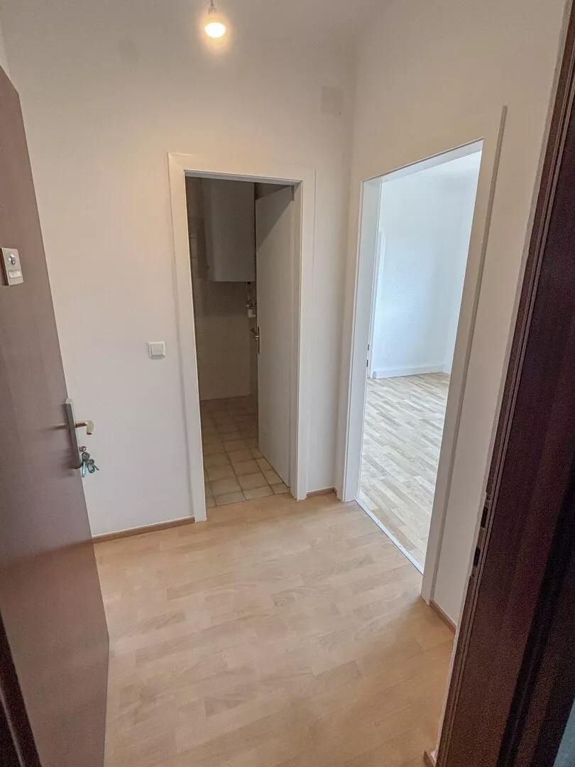 Die Wohnung besteht aus einem Vorraum, einer Küche mit Abstellraum, einem Zimmer und einem Bad mit Dusche und WC. Zur Wohnung gehört auch ein Kellerabteil.